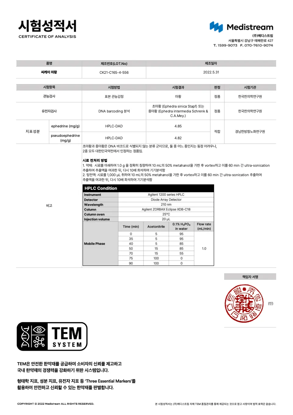 pseudoephedrine (mg/g) | HPLC-DAD | 4.82 | 적합 | 경남한방항노화연구원 |