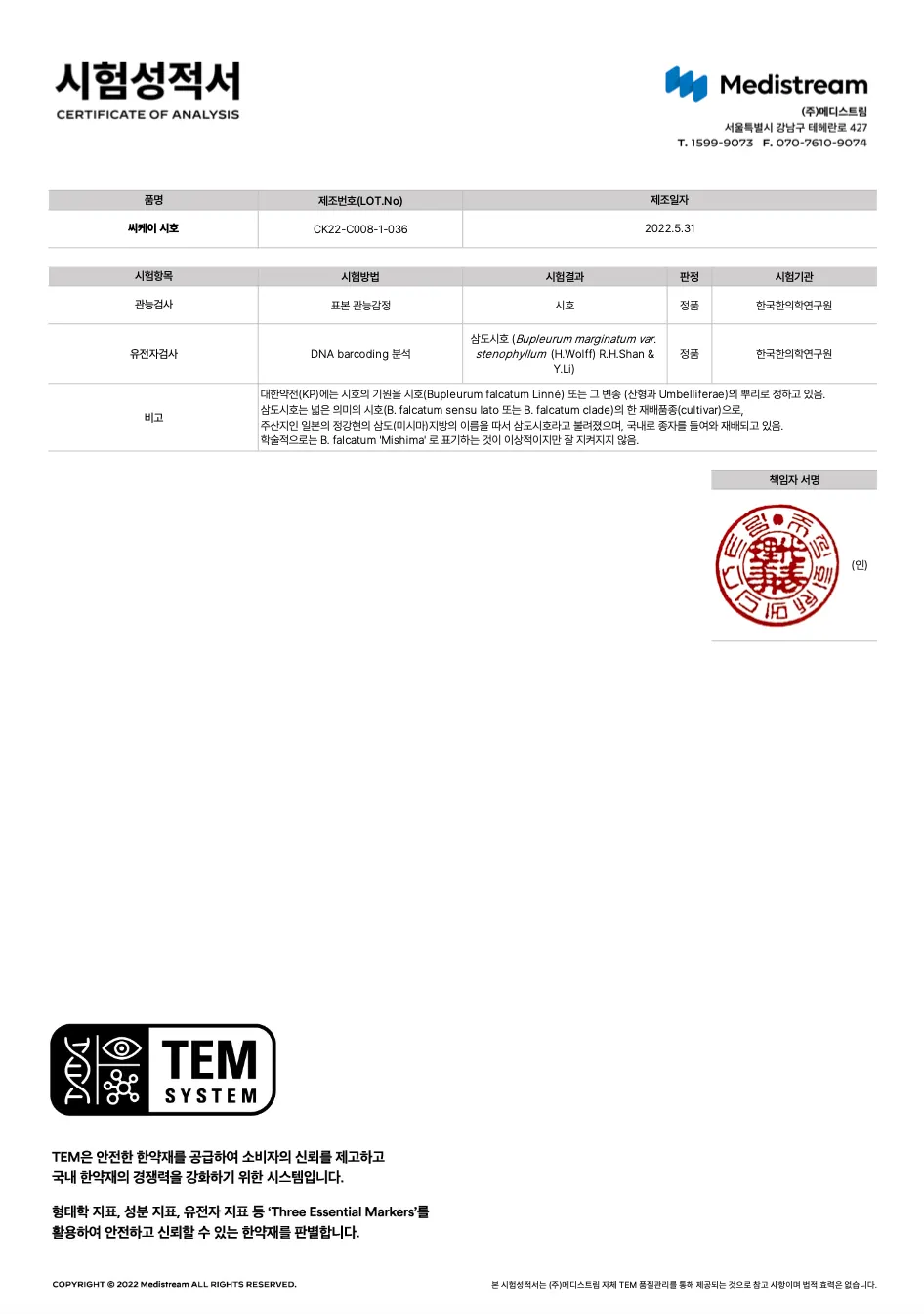 유전자검사 | DNA barcoding 분석 | 삼도시호 (Bupleurum marginatum var. stenophyllum (H.Wolff) R.H.Shan & Y.Li) | 정품 | 한국한의학연구원 |